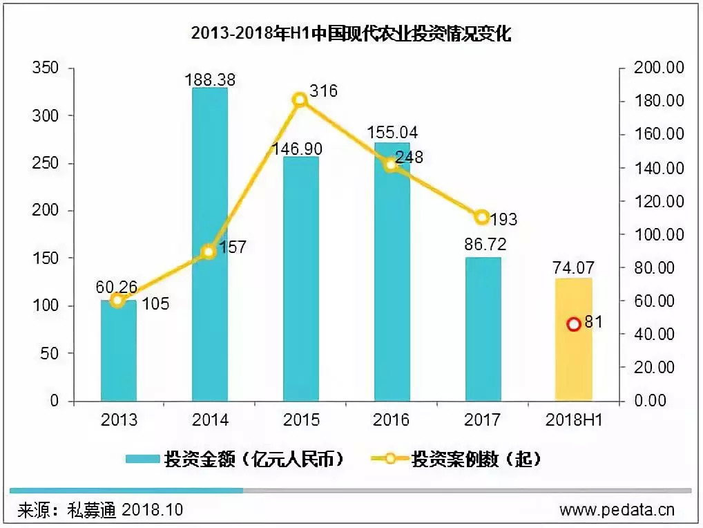 根据清科旗下私募通统计显示,2013年 -2018上半年,中国现代农业领域共计发生投资案例1,100起,累计投资金额711.38亿元。五年内现代农业投资数量和金额呈现出增长后回落的趋势,投资阶段逐渐从传统农业的中后期转向新兴农业的早期,呈现出动能转换的特征。退出方面,中国现代农业领域共发生退出事件269笔,涉及161家公司,股权转让和并购为主要退出方式。在企业并购方面,2013-2018上半年中国现代农业共发生并购事件401起,累计并购金额3,780.04亿元人民币。IPO方面,2013-2018上半年中国现代农业领域共33家企业成功IPO,共计融资金额176.57亿元。