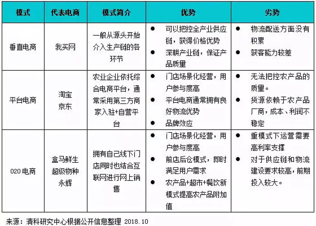 现阶段的农业电商主要分为三类:第一类为垂直电商,一般从源头开始介入生产链的各环节,即电商平台参与农产品的生产、采购与配送,例如中粮旗下的我买网等;第二种为平台电商,即农业企业依托综合电商平台,通常采用第三方商家入驻+自营平台,例如淘宝和京东等;第三种模式为O2O电商,拥有自己线下门店同时也结合互联网进行网上销售,例如盒马鲜生、超级物种、永辉等。各类型农业电商简要分析如下。