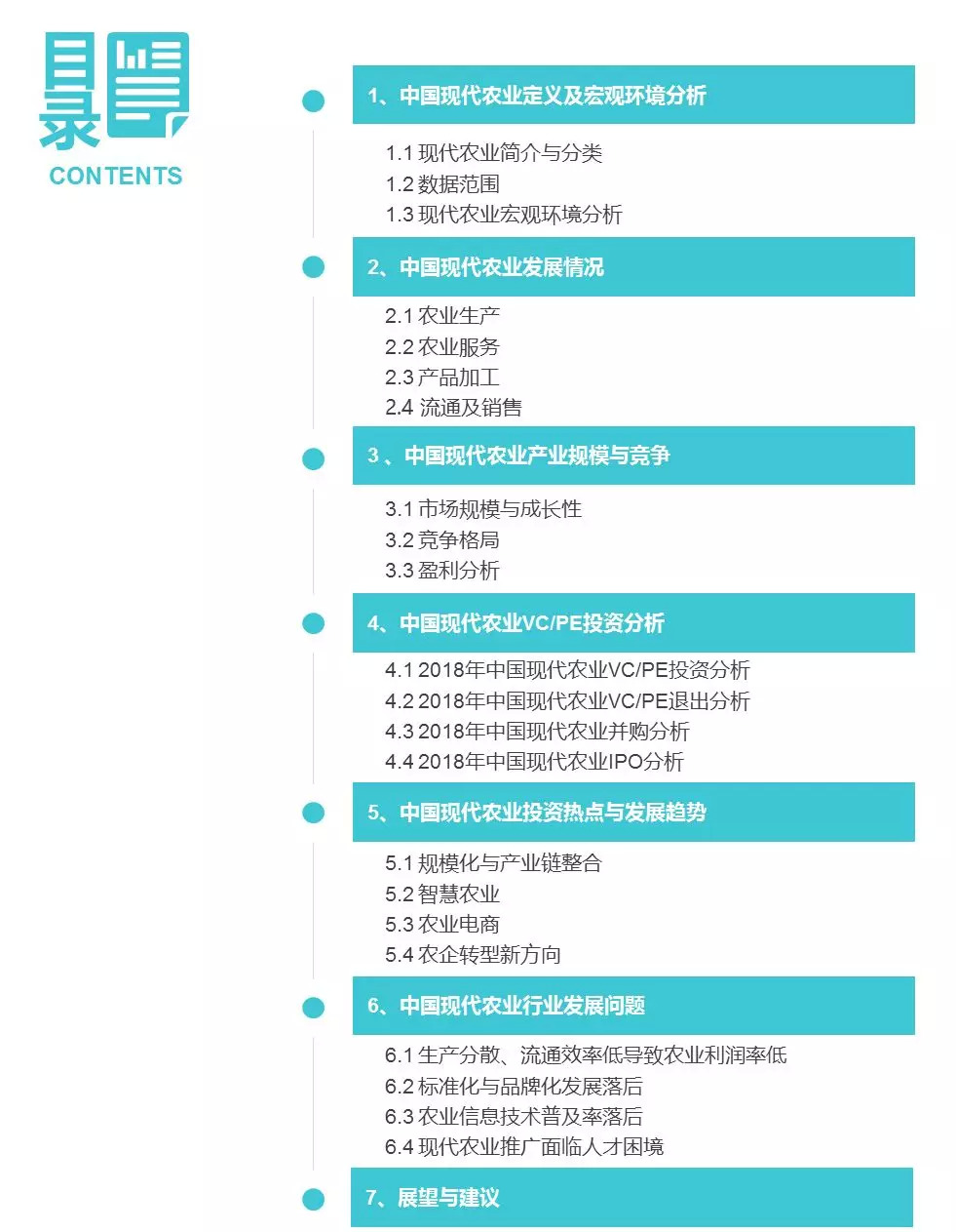 按照产业链,清科研究中心将现代农业分为农业生产、农业服务、产品加工、流通及销售四个领域。在此基础上,清科研究中心发布《2018年中国现代农业投资研究报告》,从宏观环境、发展现状、产业竞争、投资热点、发展前景以及尚存问题等角度全方位探究现代农业的价值与潜力,并为市场提供一些投资策略和建议。