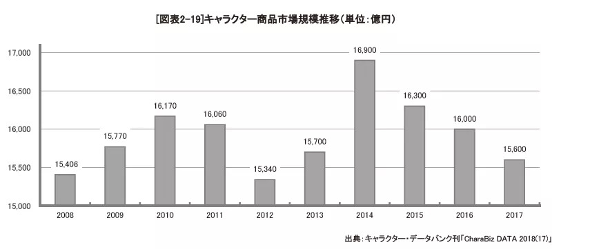 2017年日本整体的角色商品零售市场规模为1.56万亿日元,比2016年下滑2.5%。是2014年以后,连续三年的同比下降。