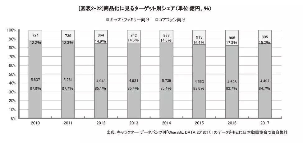 从受众分类来看,2017年“儿童·家庭向”IP衍生品占据全体市场的84.8%,其中主力IP如《面包超人》《KiraKira☆光之美少女》《龙珠超》等表现稳定。