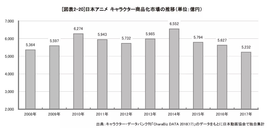 但与此同时,衍生品市场更加成熟的日本,却陷入了发展困境。据《动画产业报告2018》,2017年日本衍生品市场规模5232亿日元,同比减少7%。这已是连续三年的下跌,也是10年内的最低值。