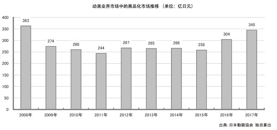 但另一方面,动画公司整体营收(狭义的动画市场)中,衍生品市场营收达到了345亿日元,比前一年大幅增长13.5%。