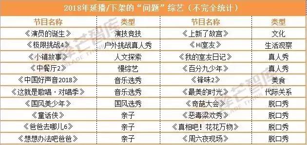 观察这份“问题”综艺名单,其中不仅包含了《极限挑战4》《中餐厅2》《中国好声音2018》《上新了·故宫》等台播综艺,《真相吧!花花万物》《周六夜现场》《爸爸去哪儿6》《想想办法吧爸爸》《国风美少年》《Hi室友》等大批网综也遭遇了延播、换档甚至下架的命运。