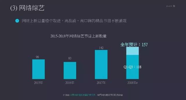 数量上,继2017年电综与网综平分秋色后,据《2018中国网络视听发展研究报告》显示,2018年网综总计上新157档,而据电视指南《2018综艺行业调研报告》显示2018一线卫视综艺数量维持过百档,与2017年基本持平。这一数据说明,2018年将是网综与电综的一道分水岭,网综在数量上实现对电综的赶超,同时头部网综在流量和话题性上也展现出了超强号召力。