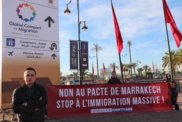 而这句话落地没多久,法国极右翼政党“国民联盟”(Rassemblement National,脱胎于“国民阵线”)领袖玛丽娜·勒庞(Marine Le Pen)的拥趸、民粹运动组织“身份认同一代”(Génération Identitaire)便在大会门前举起了“对马拉喀什协议说不,停止大规模移民”的抗议横幅。虽然这几名活动人士很快被摩洛哥警察逮捕,但该组织支持者在推特上创建的“#马拉喀什协议”标签立即得到广泛关注,抗议活动视频得到近千次转发。