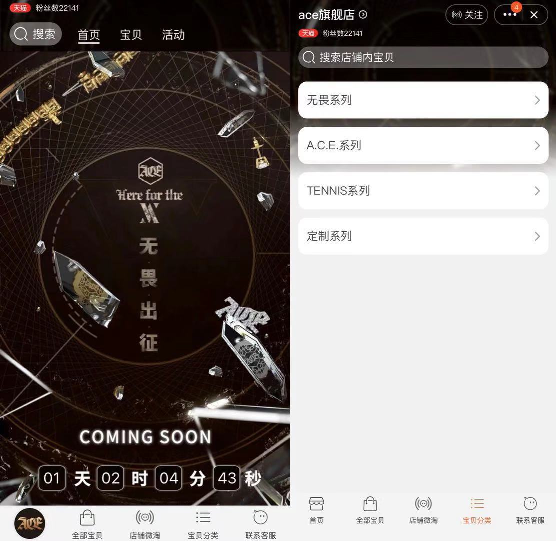 目前A.C.E品牌天猫旗舰店还没有上架商品,品牌将于12月18日晚八点正式亮相。目前可见A.C.E共有无畏系列、A.C.E系列、TENNIE系列和高级定制共四个系列。