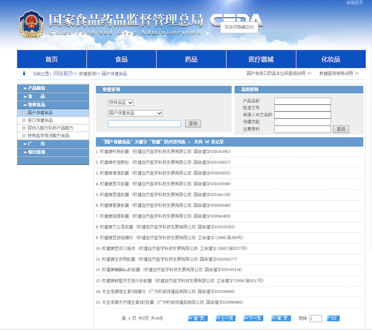 国家食品药品监督管理总局网站上公布了市面上来源合法的保健品批文。权健牌的保健品共有13项,其中,只有权健牌昱安口服液等4种产品是权健公司自己申请的批文,其余批文全部从其他公司购得。