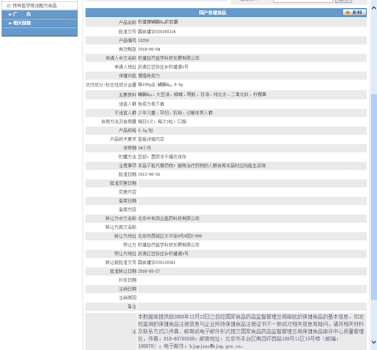食药监总局发布的信息显示,名为“权健牌辅酶Q10软胶囊”的保健品,曾于2016年5月27日被转让批文,它原本被批准的日期为2013年6月5日。