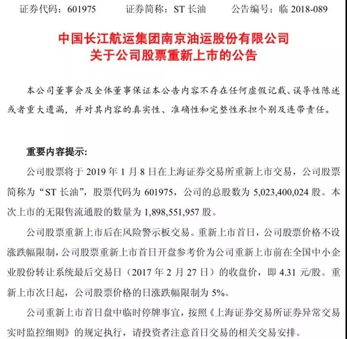 从递交重新上市申请,到最终获批上市交易,长航油运用了7个月时间。长航油运自2018年6月4日向上海证券交易所提出重新上市申请,经过了审核、提交反馈意见、获准上市、摘牌新三板等一系列操作后,2019年1月8日将上市交易,这是A股市场重新上市制度的首单实践,打通了资本市场“能上能下”的运行机制。