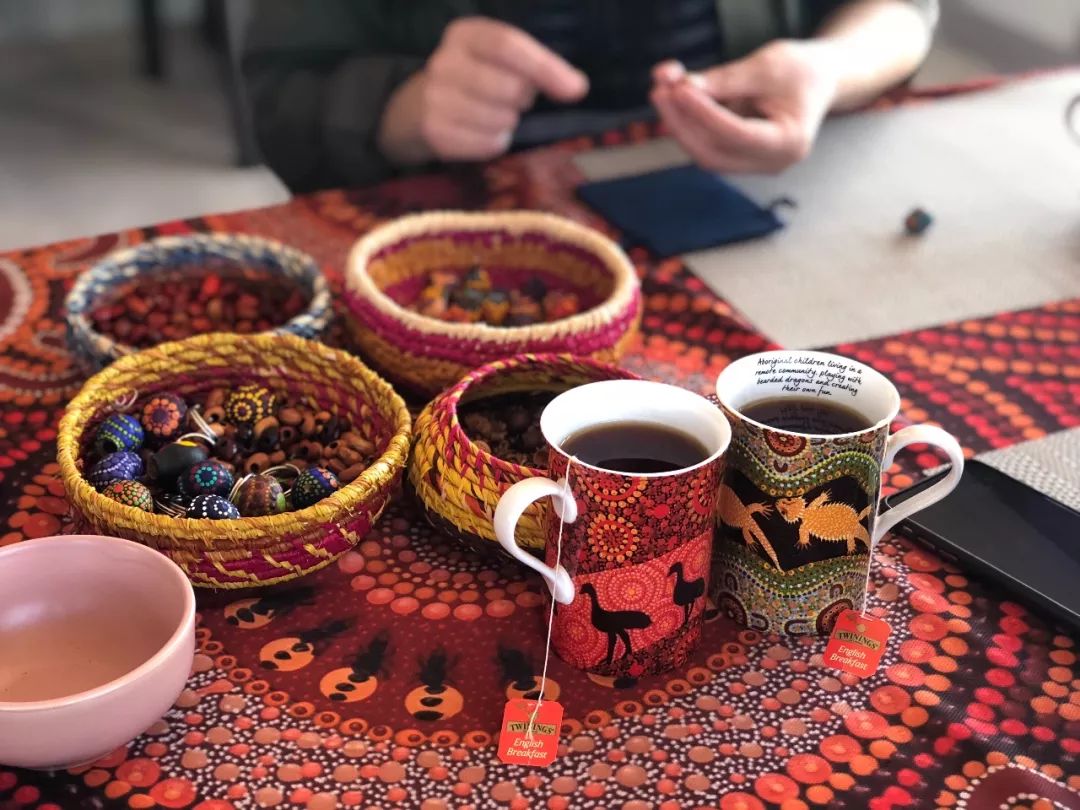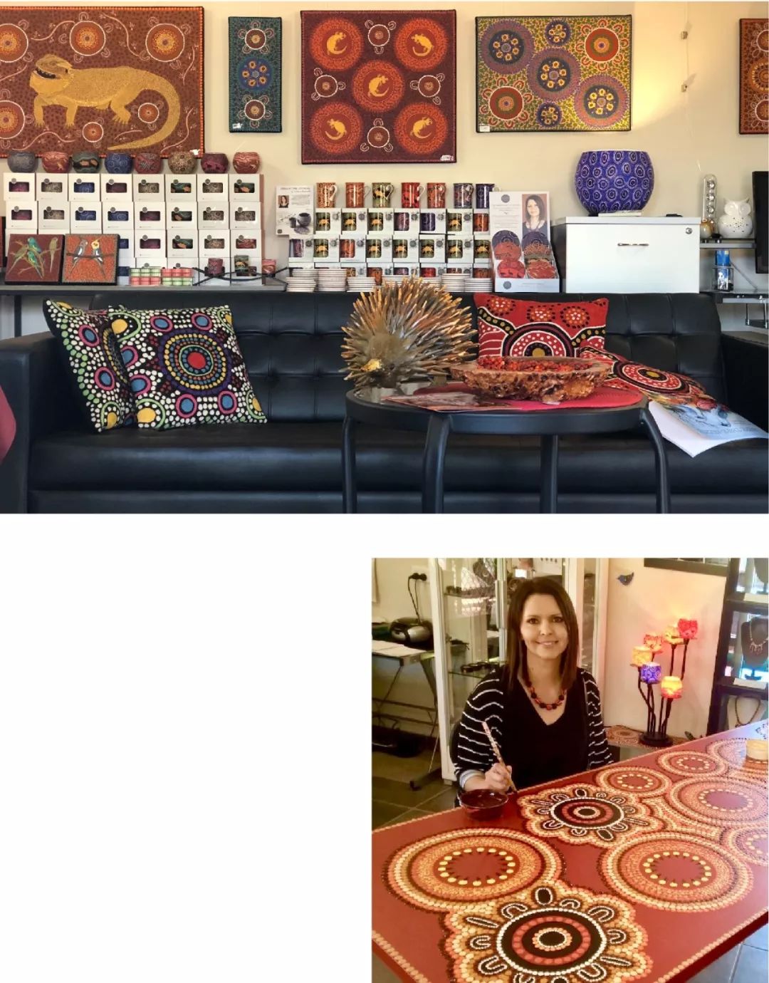 Kathleen Buzzacott’s艺术工作室受传统影响,形成精品点画风格,以及大胆明亮的用色偏好;绘画内容中,一个明显的特色是本土动物和家庭狩猎、采集故事,灵感主要来源于与土著家庭一起成长的童年回忆。