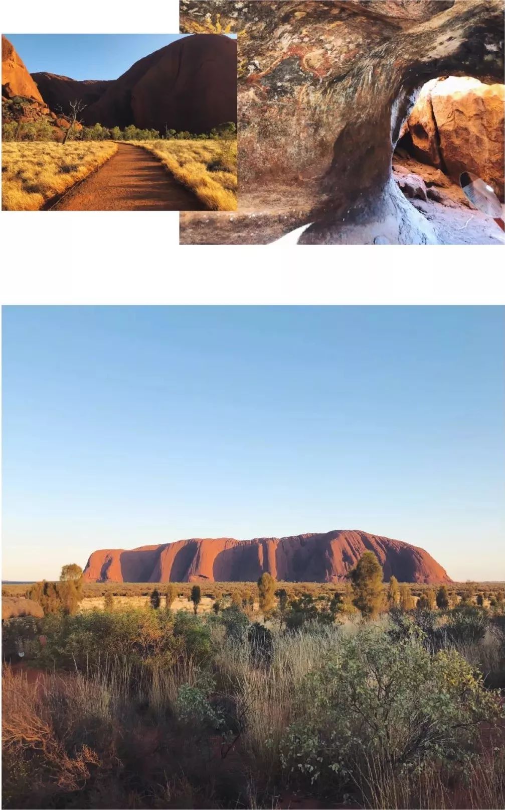 高空中俯瞰澳大利亚的砖红色,在地表是红色砂岩分崩而成的荒漠砾土,还有历经岁月剥蚀,遗世相望的乌鲁鲁和卡塔丘塔。