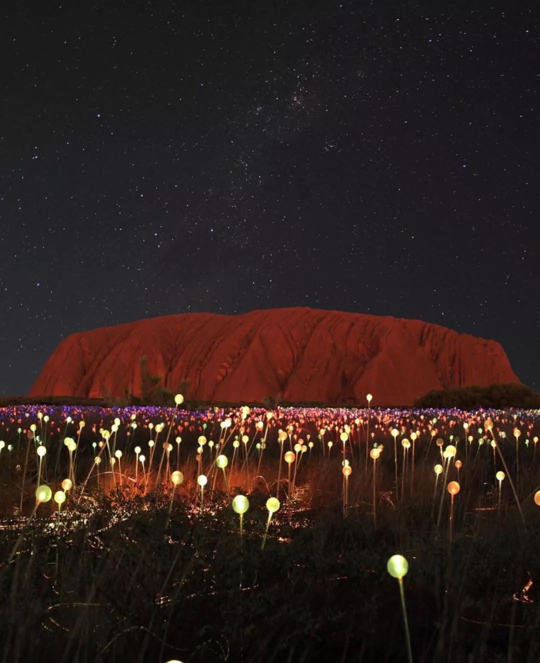 Bruce Munro将这一拳头产品的灵感来源,归功于1992年他和当时的未婚妻、现在的妻子一起来看乌鲁鲁的时刻。终于,2016年,“原野星光艺术装置展”回到灵感开始的地方,在乌鲁鲁完成了安装,成为该艺术作品迄今规模最大的一处。