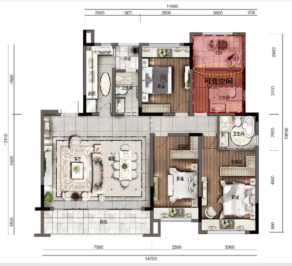 如图所示,标注区域为望江府根据家庭结构及需求预留的可变空间。例如,入住的是三口之家,该房间可改为茶室、书房或功能室;若后期家庭新增新成员,则可变为另一儿童房,满足不同阶段家庭的需求。
