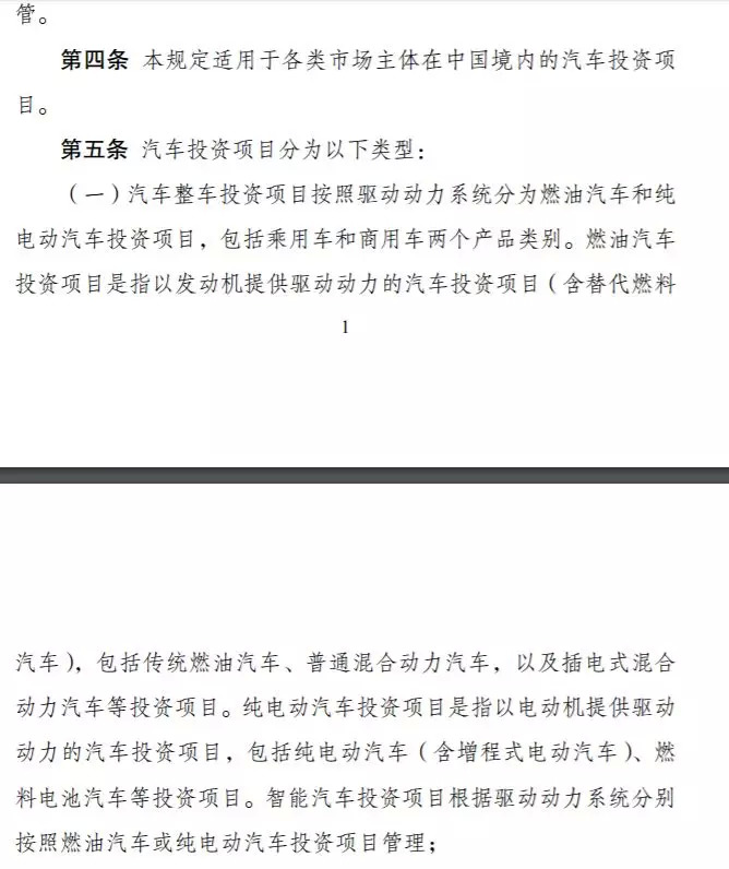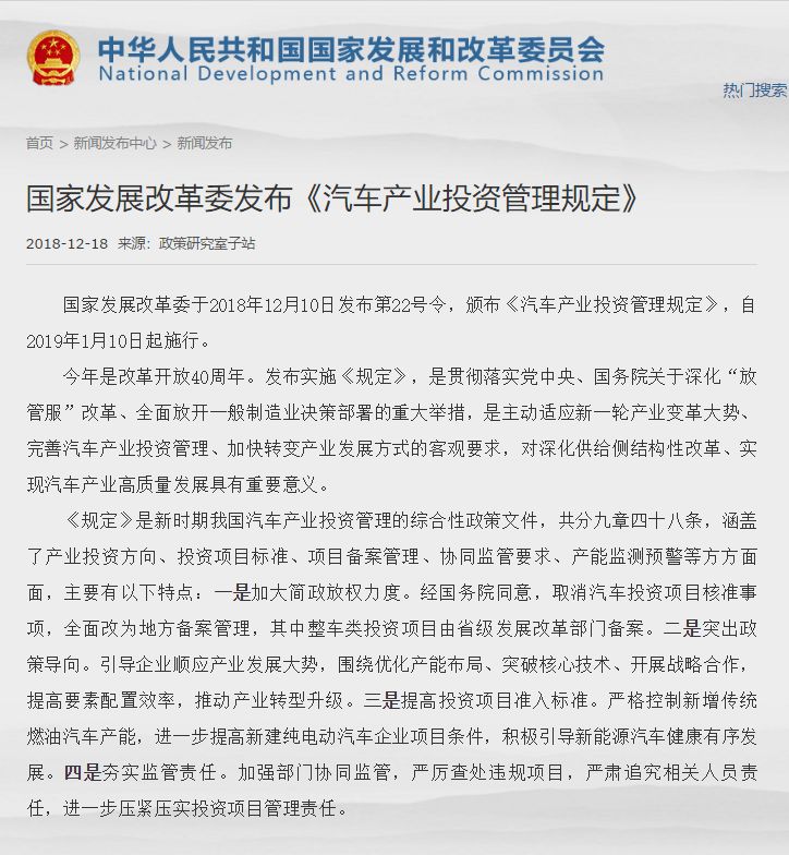 12月18日,国家发改委在官网上发布了《汽车产业投资管理规定》,内容指出:自2019年1月10日起,在汽车整车投资项目领域,普通混合动力汽车和插电式混合动力汽车被划归为燃油汽车类,而纯电动汽车(含增程式电动汽车)、燃料电池汽车等归为纯电动汽车投资项目。