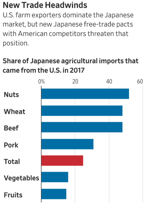 《华尔街日报》报道称,美国农民十分担心会失去日本市场份额,因为日本是他们最大的出口市场之一。美国农业生产商是日本最重要的食品进口商,至少占其市场份额的25%,高于欧盟的13%。