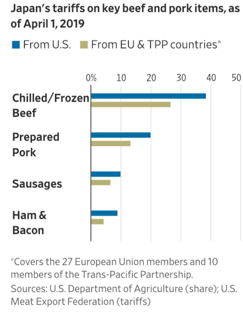 据美国肉类出口联盟(The US Meat Export Federation)估计,日本签署(没有美国参加)的新贸易协议会严重损害美国的牛肉和猪肉出口,未来五年内的损失预期将达到10亿多美元。