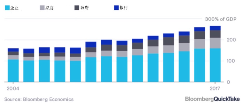 上图为房价增长率和TFP增长率的变动趋势图,左轴是房价增长率,右轴是TFP增长率,两者呈反向关系,2008年之后的情况应该也差不多。而从图3中可知,中国现在的债务占GDP的比例相比2008年几乎涨了一倍,接近GDP的300%。