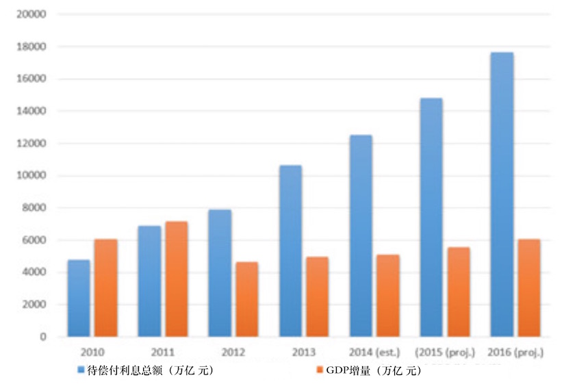 图7为中国历年GDP增量与待偿付利息总额,橙色的柱状图表示GDP增量,蓝色柱子代表当年应偿付利息。由图7可知,2012年是一个关键的转折点,GDP增量首次跌落当年应偿付利息总额之下。如果把中国看成一个企业,2012年新增的GDP增量还不够偿还利息。2008年之后债务一路高涨,2007年家庭债务总额只有四万亿,到了今年家庭债务到达45万亿。当前家庭债务问题的流行说法叫“消费降级”,家庭已经开始减少消费了。