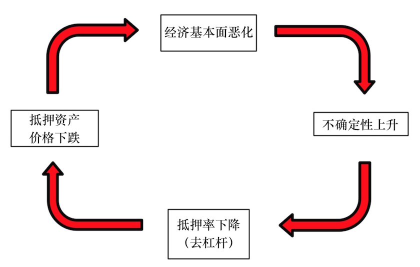 但经济坏的时候,事情就会变得棘手。对未来的不确定性会导致去杠杆,今年的中美贸易摩擦以及其他事件增加了这一不确定性,客观上降低了杠杆率,进而导致抵押品价值下降,企业违约、破产等等,引起了恶性循环。强制去杠杆存在非常大的问题,可概括为以下主要三点:杠杆率下降;最乐观的人此前用高杠杆,此时被强制平仓,破产出局;边际购买者乐观程度下降。最乐观的人离场与杠杆率的下降近一步压低资产价格,形成一个恶性循环,危及整个建立在底层资产基础上的金融大厦。