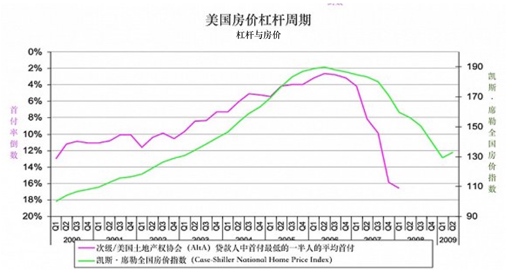 上图可以直观揭示住房市场的杠杆周期,绿线代表住房价格,红线为首付率倒数(杠杆),可以发现两线基本是呈1:1变动,而在这段时间内利率几乎没有变化。可见要理解金融危机的产生,除了利率之外,还必须兼顾杠杆这一重要维度。