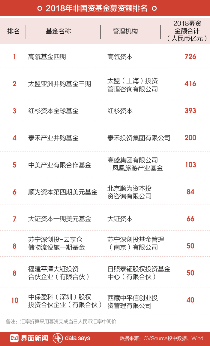 本篇以2018年非国资主导的股权投资基金募集事件为观察视角,基于募集金额对2018年以来1,363次基金募集事件进行筛选后大排名,数据来自投中CVSource和Wind,由界面新闻研究部整理。