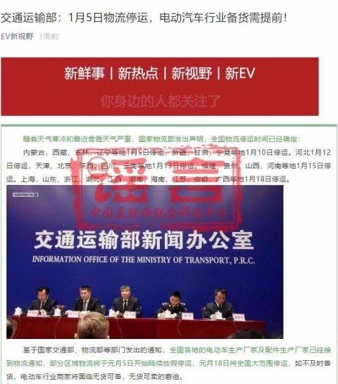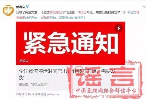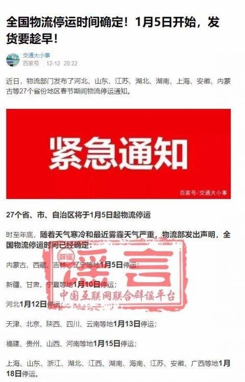 近日,网上出现了“1月5日物流停运”等相关传言,中国互联网联合辟谣平台向交通运输部求证,此为谣言!