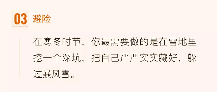 打个比方,在寒冬时节,你最需要做的是在雪地里挖一个深坑,把自己严严实实藏好,躲过暴风雪。相反,在这个时候如果选择来到地面野蛮生长,被冻成冰棍的概率就比较高了。