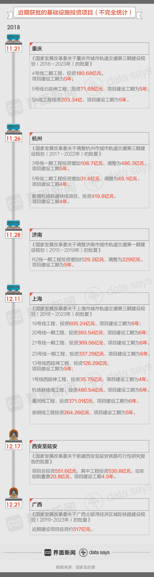根据国家发改委数据,2018年最后两个月,至少6个基础设施投资项目获国家发改委批复,部分项目规划至2023年。