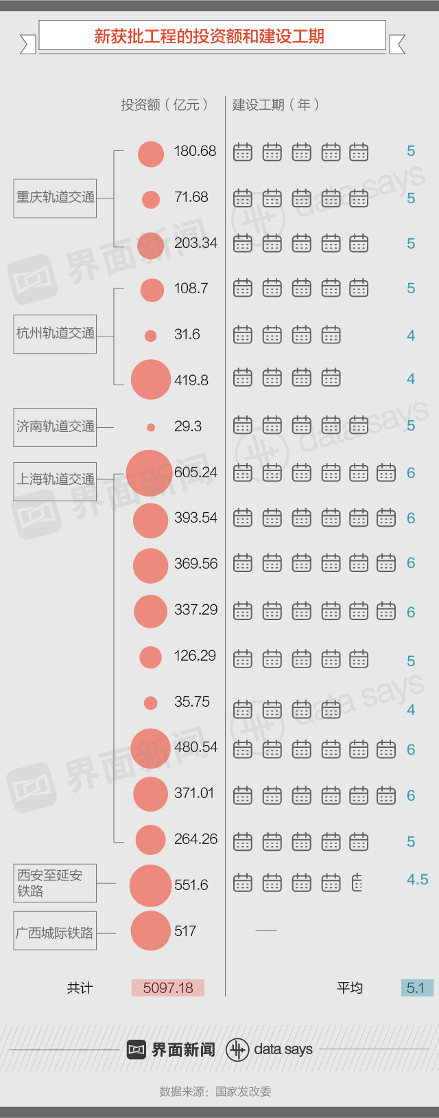 据界面数据(公众号ID:tuli_shuju)不完全统计,上述工程项目总投资额共计5097.18亿元,平均建设工期约5.1年。