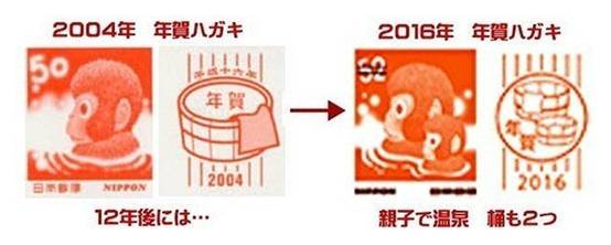 2004年是猴年,贺年明信片的邮票设计师星山里佳画了一只泡温泉的猴子,传达寒冬中的一丝温暖。12年后,星山还是设计一只泡汤的猴子,不过桶子里多了小猴子。原来,当年单身的猴子在12年后有了后代,它们现在是亲子一起泡汤,日本人看了纷纷大呼感动。