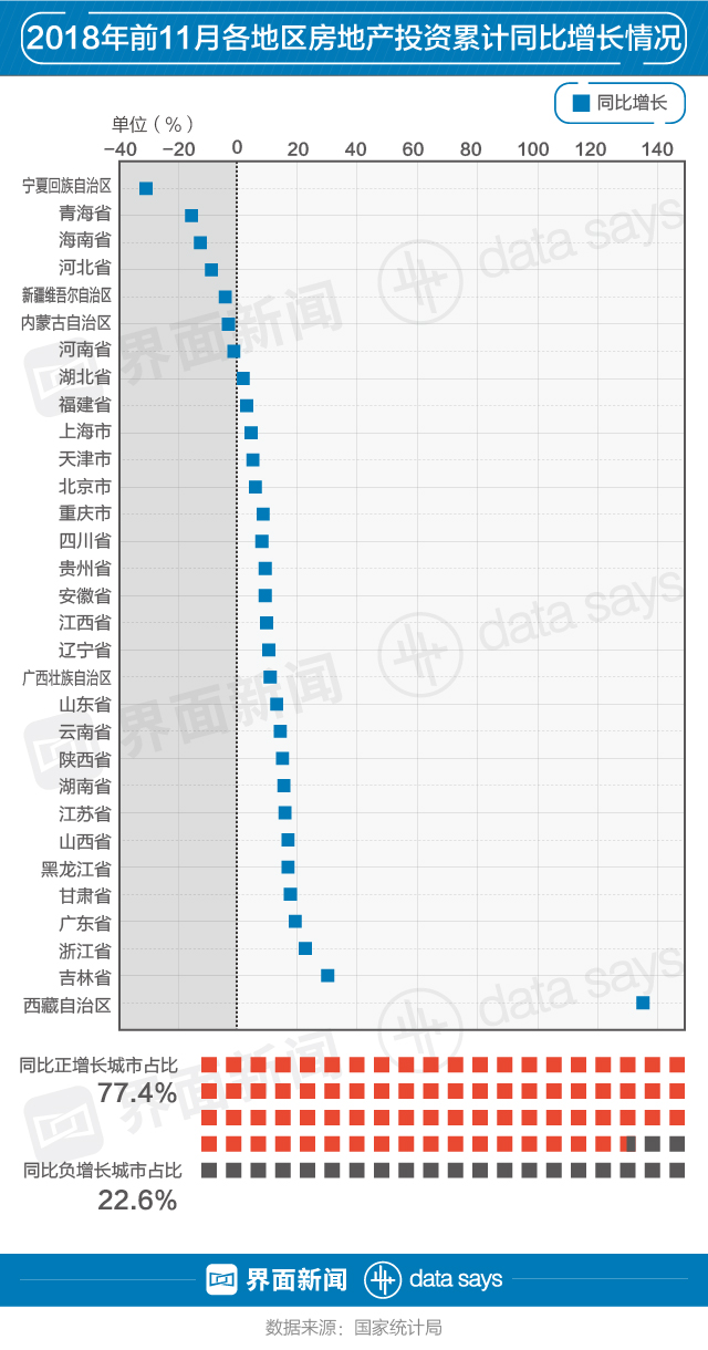 从同比增长情况来看,2018年前11月七成以上地区房地产投资额超去年同期水平。