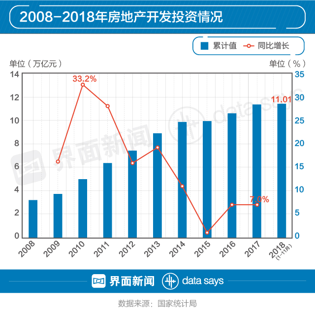 据国家统计局数据,2018年前11月房地产投资累计总额11.01万亿,再创历史新高。