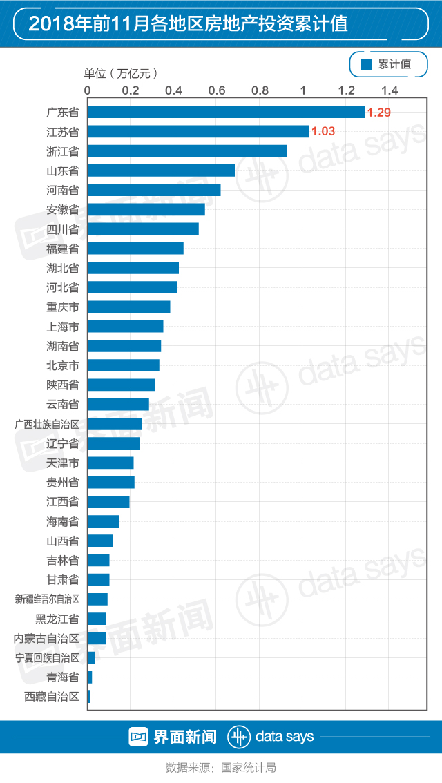据国家统计局数据,2018年前11月房地产投资累计总额11.01万亿,七成以上地区房地产投资额超去年同期水平。广东省和江苏省位列榜首,累计投资分别达1.29万亿和1.03万亿。