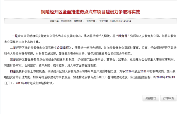 根据《公告》显示,安徽铜陵经开区将加大安徽奇点公司乘用车生产资质申报力度,力争2020年底至2021年初取得资质。