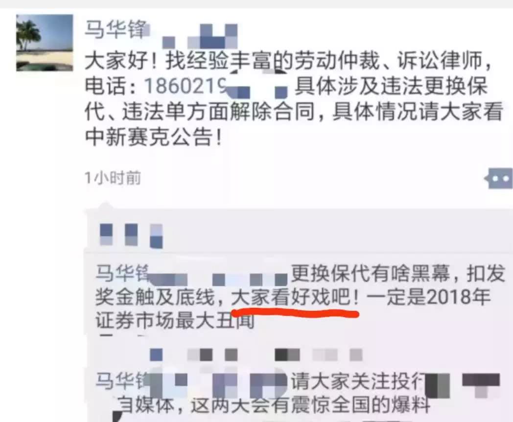 怒气难平之下,马华锋发了一条朋友圈,请“大家看好戏”。好事者迅速将其评定为“2018年证券市场最大的丑闻”。