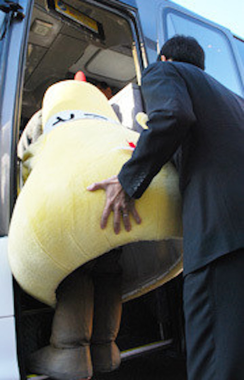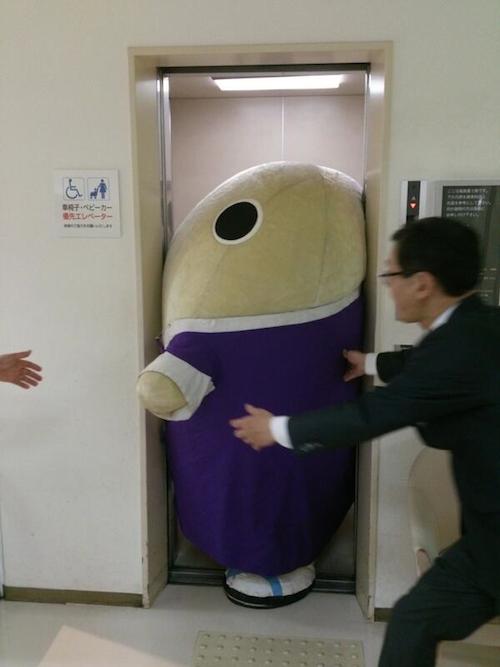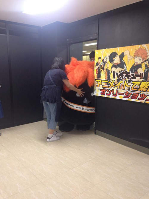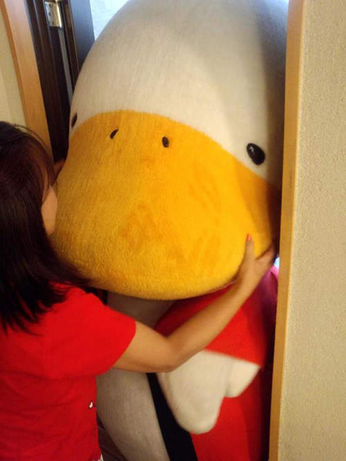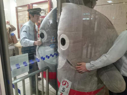 于是就有了一大波吉祥物们被卡在门口的照片。看它们拼命往门里塞的样子,为什么完全不想去救它们咧?