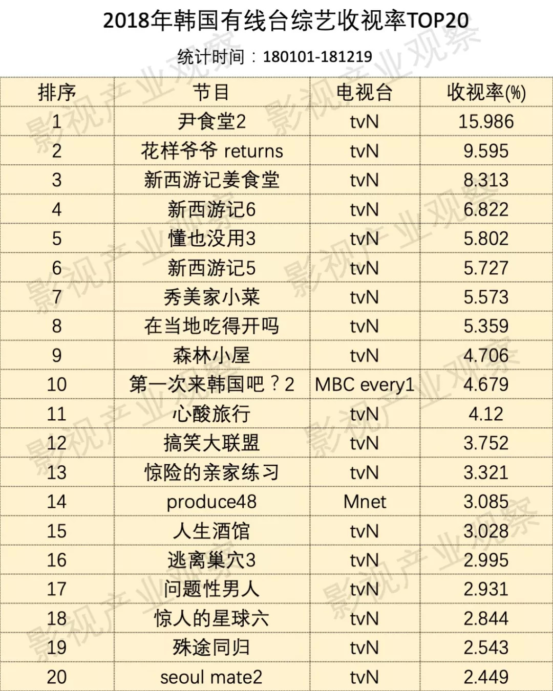 有线台方面,收视率前三的纪录由《尹食堂2》、《花样爷爷 Returns》、《姜食堂》保持,整体以tvN、罗PD的节目为主;