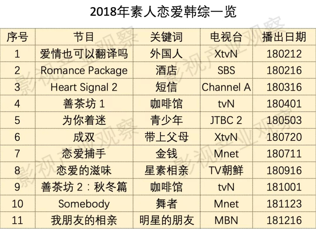 在2018年,以《Heart Signal 2》为代表的素人恋爱节目共计11档(含《善茶坊》两季、《恋爱的滋味》主打明星与素人的相亲)。