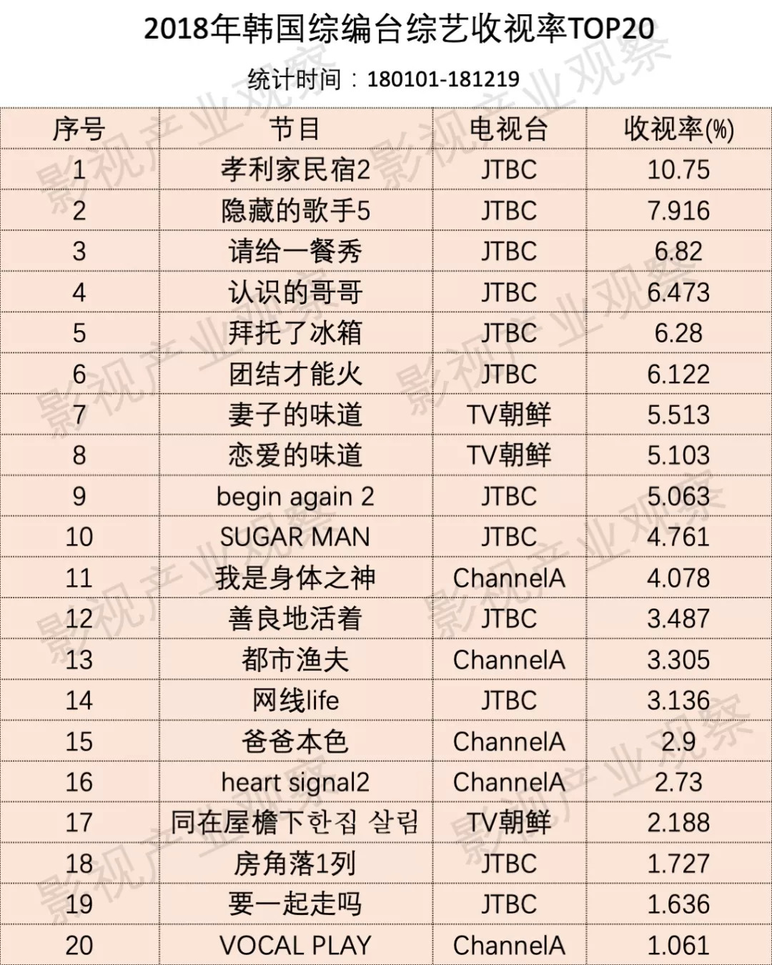 4、韩国盖洛普收视率,统计时间截至12月19日;2018年之前开播的节目取2018年收视率最高值