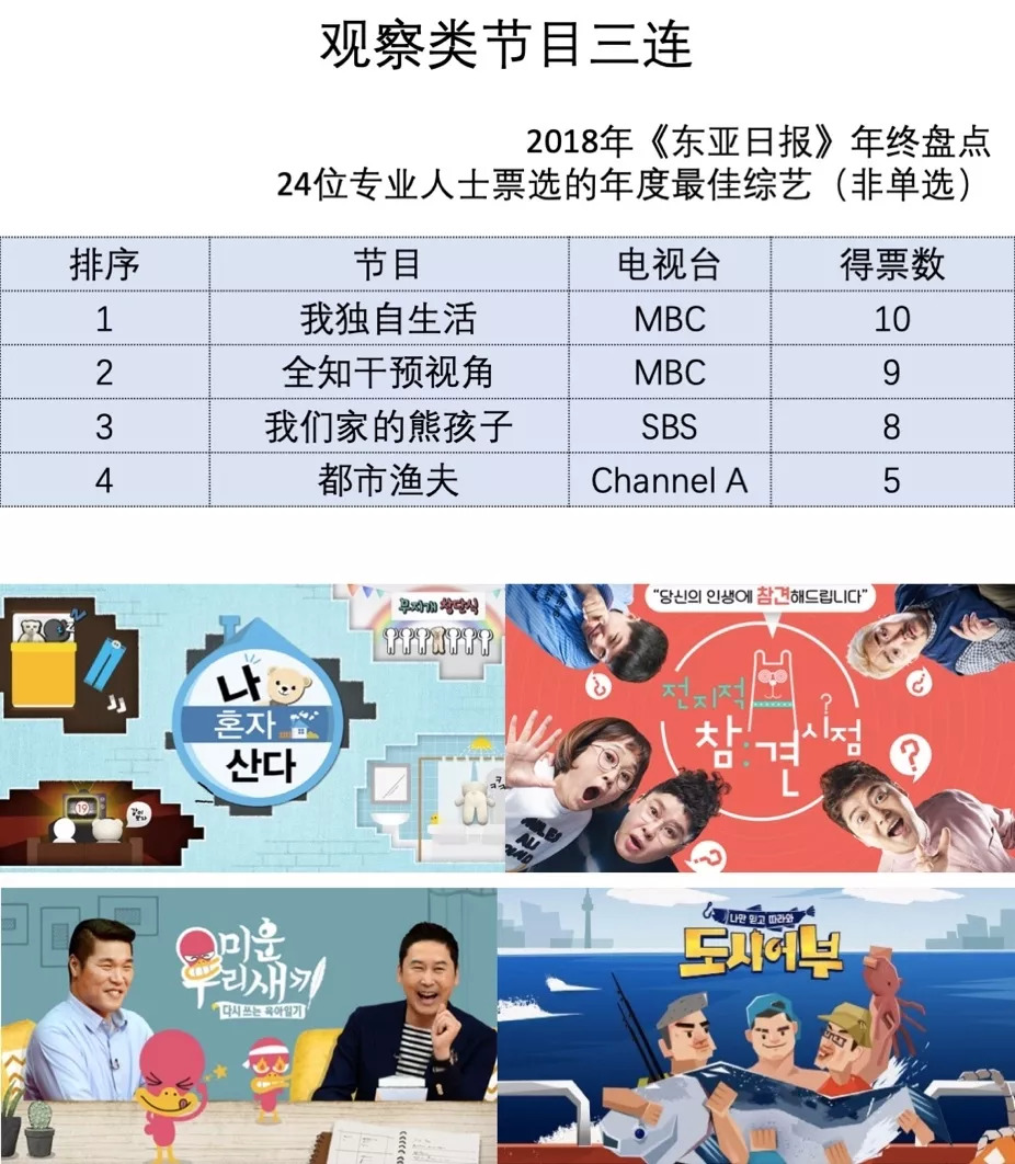 再者,韩国《东亚日报》年终盘点邀请了24位业界专家(含电视台PD、编剧作家、节目制作公司、教授、评论家)进行投票,“年度最佳综艺”排名前三的依次是《我独自生活》、《全知干预视角》、《我们家的熊孩子》。