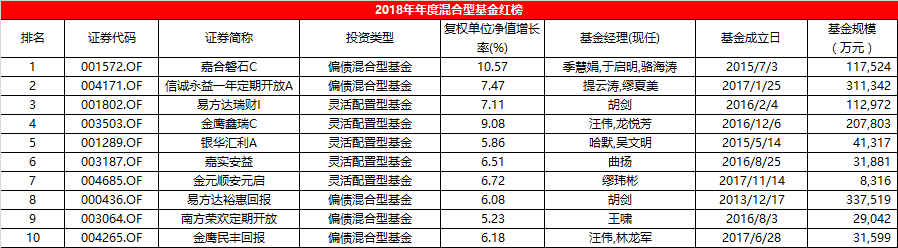 下表为年度综合得分排名前十的混合型基金。(若同一基金不同份额同时上榜则选取C类份额)