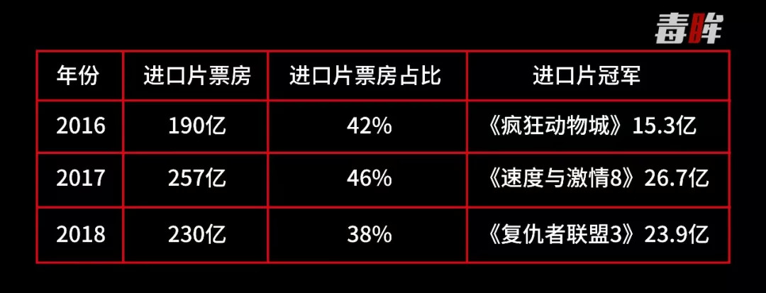 2018年,电影市场给人的一大直观感受就是“进口片似乎卖不动了”:在国产片、进口片总数没有太大变化的情况下,2018年进口片总票房仅有230亿,较2017年减少了57;进口片票房占比仅有38%,为近三年来最低值;年度票房前三中没有一部进口片,而过去4年里每年都至少会有一部。