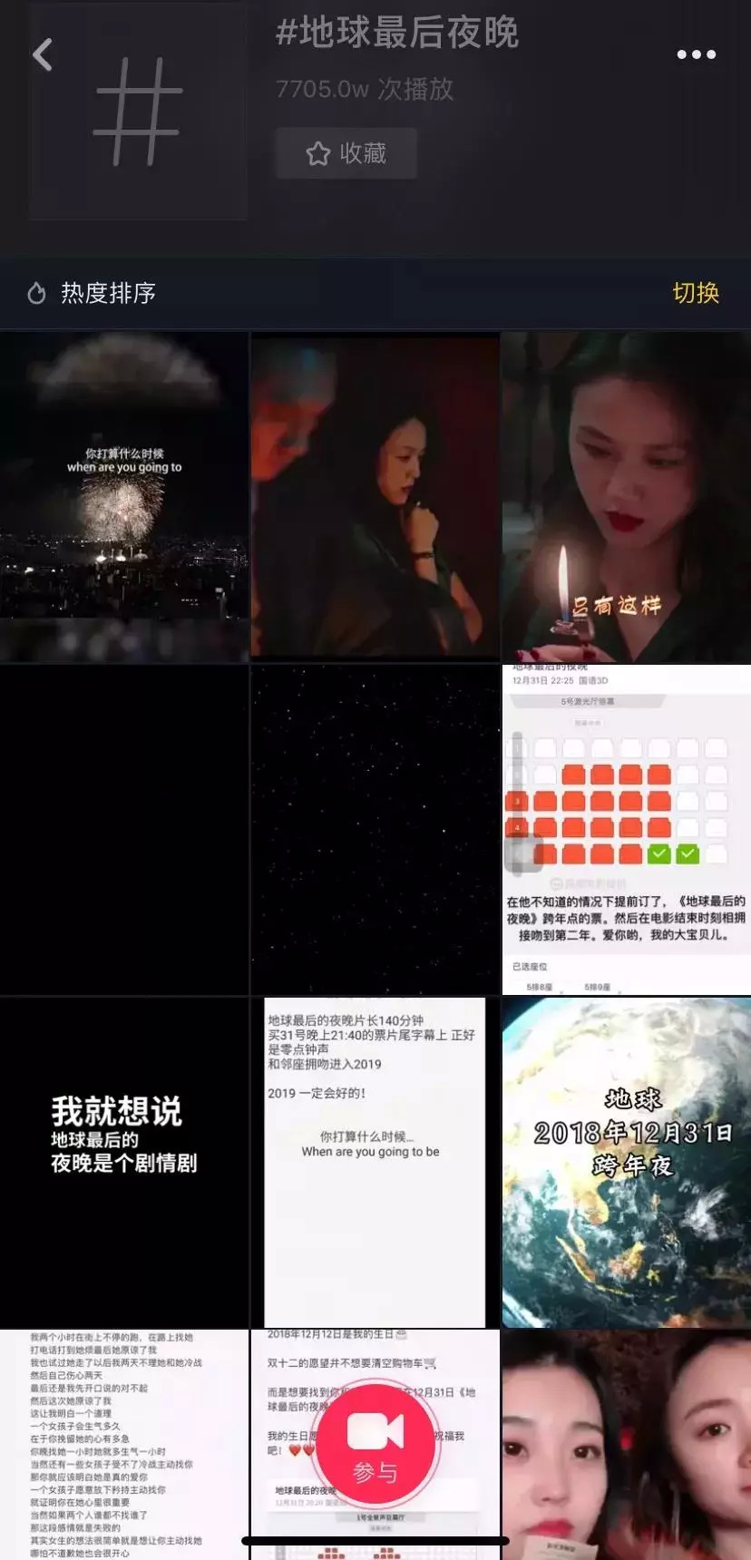 《地球最后的夜晚》则是2019年开年最值得探讨的一个案例。这样一部小众文艺片,虽然在上映第二天票房跌幅创历史纪录的超过了95%,但影片在预售时收获超过1亿票房、首日成绩达到2.6亿,还是刷新了多项文艺片的纪录——这靠的并非口碑和质量,而是“和最重要的人一起跨年”、“一吻跨年”、“在影院摆2019(或心形)”等内容在抖音上传播所带来的热度,影片上映前相关微博话题的阅读总数已经超过了2亿。