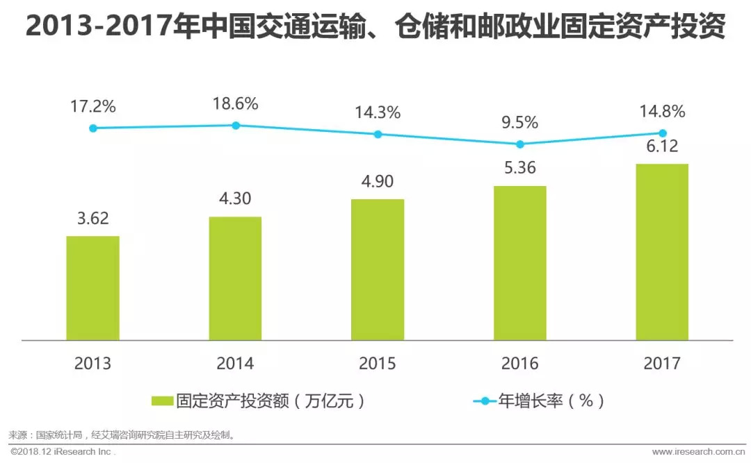 交通运输及相关领域的固定资产投资与基础设施建设是汽车工业产值快速增长的先决条件之一。2013-2017年,中国交通运输、仓储和邮政业固定资产投资年均增长率接近15%,是社会固定资产投资年涨幅的近2倍水平。