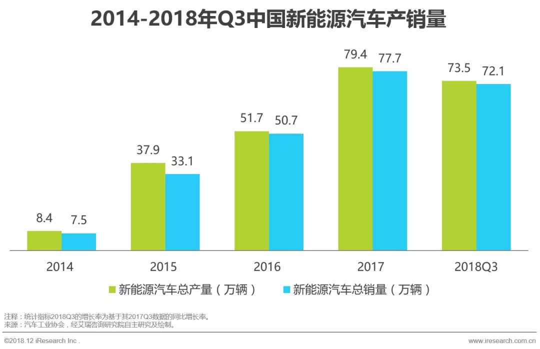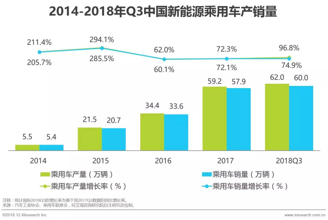 乘用车是中国销量最高的新能源汽车类别,2018年前3个季度,新能源乘用车销量达60万辆,已超过2017年全年水平,其2018年内市场渗透率已达到2.4%。保守估计,2018年底新能源乘用车产销量均可达到100万辆左右。