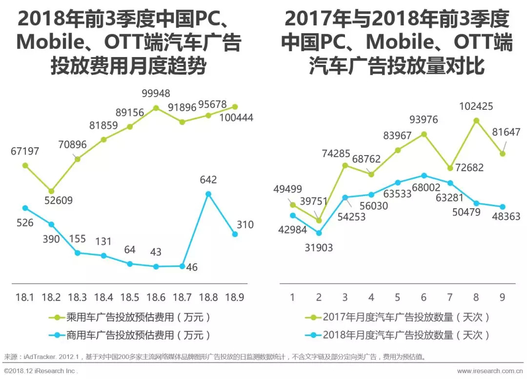 受“车市寒冬”影响,2018年汽车行业整体营销传播力度大幅减弱,营销投入成为部分车企经营压力下的削减对象。2018年前3季度,营销传播费用上涨明显,在PC、Mobile与OTT端的广告投放总费用达到75.56亿元,同比增加15.8%;而营销传播力度则大幅下降,广告投放天次总量较上年同期减少近30%,特别是三季度,广告投放总量仅为上年同期的63.6%。艾瑞认为,在车市疲软和营销传播费用增加造成成本上涨的双重压力下,车企营销传播投入的回暖速度十分有限。