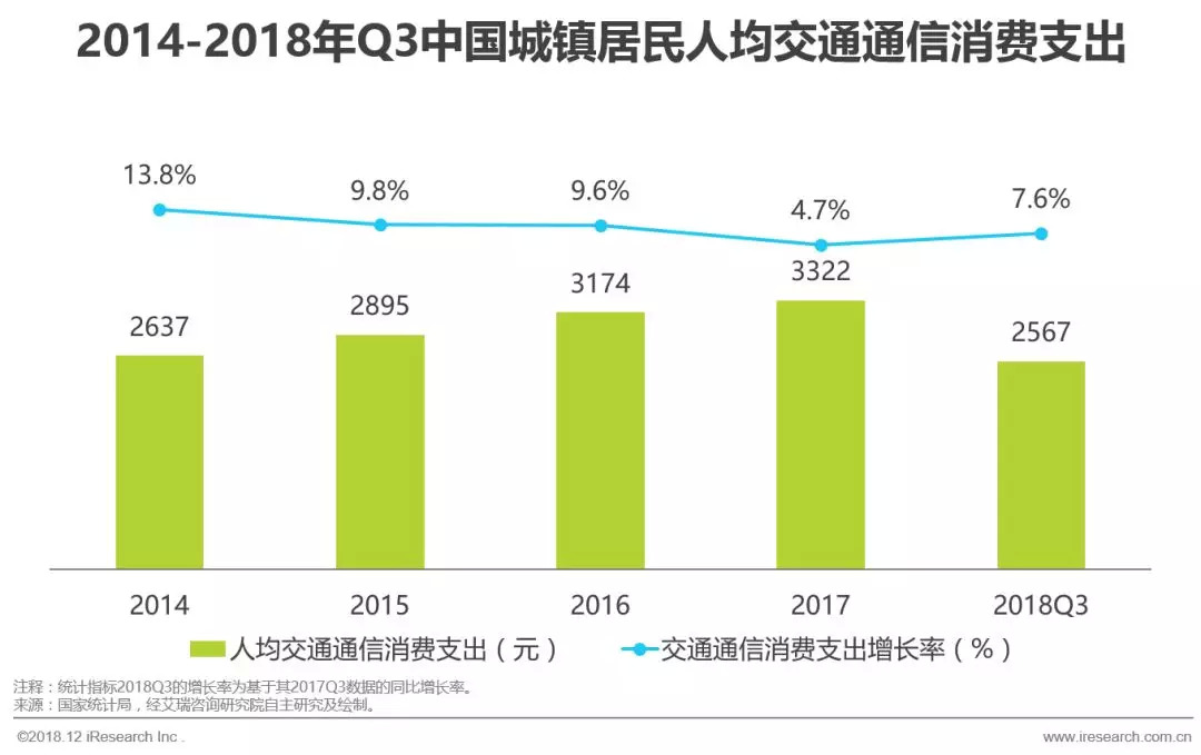 2018年前3个季度,城镇居民人均交通通信支出占总消费支出的13.5%,同比增长7.9%。结合近5年内趋势与居民消费下降的变化看,城镇居民人均交通通信消费支出增速将在近期内保持缓速上升。