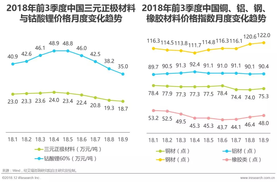 新能源汽车成本的近40%集中在动力电池上,而正极一项又占整个动力电池成本的约30%,因而被广泛用作正极材料的钴材料就具备了关键的成本参考价值。经历了2017年末开始的暴涨后,钴酸锂和整体三元材料的价格已开始回落并保持平稳。