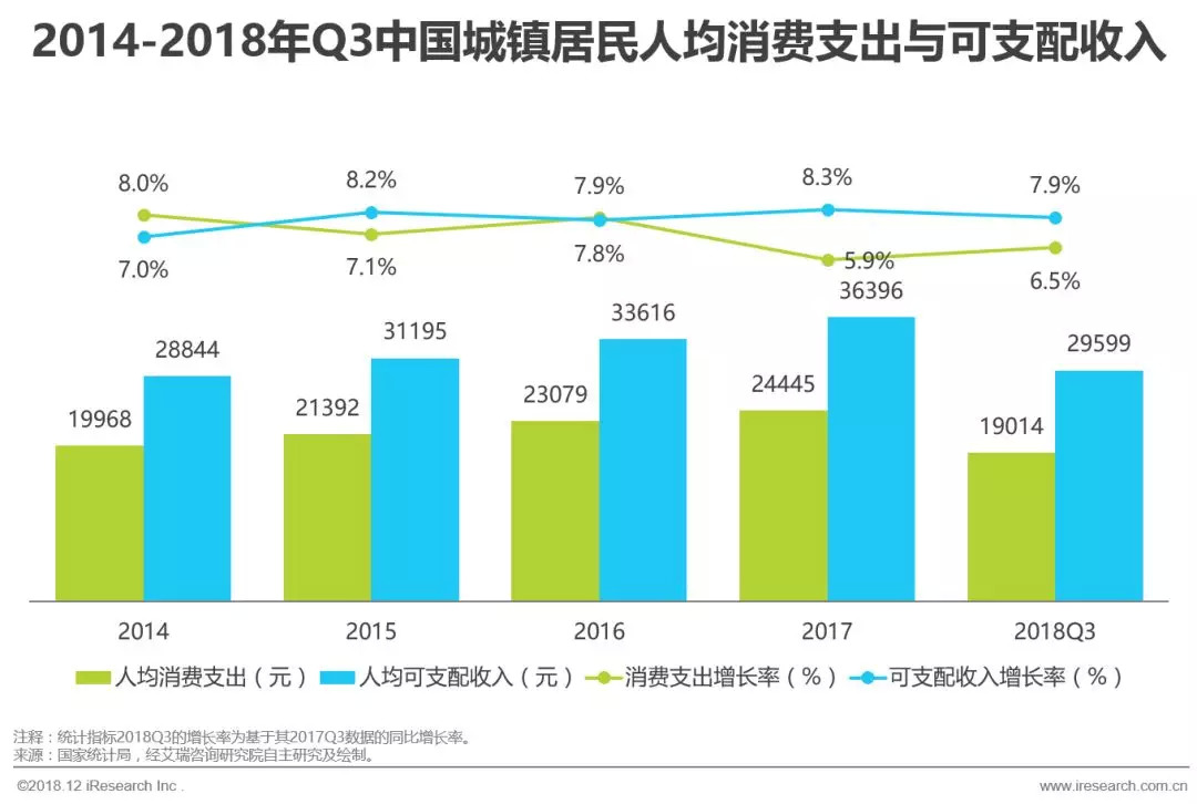 消费是中国经济增长的三驾马车之首,之于汽车行业更是如此。在城镇居民人均可支配收入稳定增长的同时,消费支出增长率却有所放缓。2017-2018年三季度,城镇居民消费支出增速明显低于可支配收入增速。